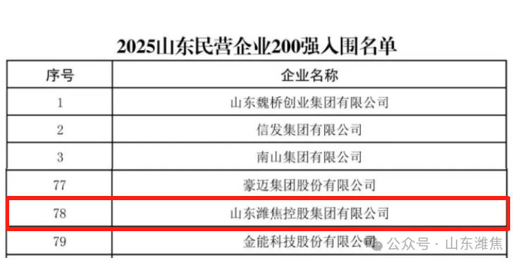 近日,山東省工商聯(lián)、省發(fā)展改革委、省科技廳、省人力資源社會(huì)保障廳、省農(nóng)業(yè)農(nóng)村廳、省商務(wù)廳、省稅務(wù)局、省市場監(jiān)管局、省總商會(huì)共同組織開展了2025山東民營企業(yè)百強(qiáng)系列榜單發(fā)布活動(dòng)。山東濰焦控股集團(tuán)有限公司榮登“2025山東民營企業(yè)200強(qiáng)”第78位。